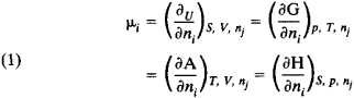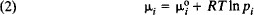 where pi is the partial pressure of component i in the mixture, R is the gas constant, and is the value of μi at pi = 1 atmosphere. For a mixture of nonideal gases, the fugacity of the component must be included in equation (2).