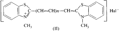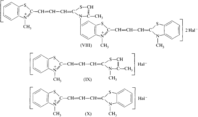 In 1964 the Soviet chemist A. I. Kiprianov demonstrated that the intramolecular interactions of chromophores affect the chromaticity of dyes. For example, biscyanine (VIII) is characterized by two λmax (522 and 581 nm), which are shifting with respect to the λmax of the initial dyes (IX) and (X) (562 and 558 nm, respectively) in the short-wave and long-wave portions of the spectrum, respectively.
