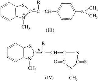 Steric hindrances in the chain of conjugation substantially alter the nature of absorption (seeSTERIC HINDRANCE). Thus, if the rotation of one part of a molecule of dye relative to another occurs along a bond similar to a simple bond, for example, a in (III), then the hypsochromic effect is observed; if rotation occurs along a bond of a higher order, for example, b in (IV), then the bathochromic effect is observed. For example, upon the substitution of R = CH3 for R = H in (III), λmax varies from 528 nm to 467 nm, and in (IV), from 521 nm to 542 nm.
