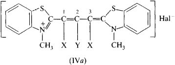 The color of a dye is extremely sensitive to the introduction of the polar substituents X,Y in the polymethine chain. Electron-donor substituents in the even positions of a chain of conjugation induce the hypsochromic effect, whereas electron-acceptor substituents induce the bathochromic effect. The reverse occurs upon the introduction of the same substituents into the odd positions. For example, for (IVa) at X = Y = H, λmax = 558 nm; at X = H and Y = OCH3, λmax = 495 nm; and at X = OCH3 and Y = H λmax = 586 nm.