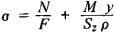 where F is the area of the cross section, N is the longitudinal force, M is the bending moment in the cross section defined with respect to the axis Z0 passing through the center of gravity of the cross section (C), y is the distance from the fiber being examined to the neutral axis z, p is the radius of curvature of the fiber being examined, and Sz = Fy0 is the static moment of the cross-sectional area with respect to the axis z. The displacement Y0 of the neutral axis relative to the center of curvature of the curved beam is always directed toward the center of curvature of the curved beam and is usually determined from special tables. For a circular cross section, Y0 ≈ d2/16R; for a rectangular cross section, Y ≈ h2/12R (R is the radius of curvature of the axis of the curved beam; d and h are the diameter and height of the cross section of the beam, respectively). Normal stresses in a curved beam have their maximum values (in absolute magnitudes) near the concave edge of a beam and vary in the cross section according to a hyperbolic law. For small curvatures (R > 5h) the determination of normal stresses can be made in the same way as for a straight beam.