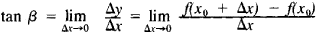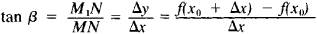 where Δy = M1N = f(x0 + Δx) - f(x0) is the increment of the function on the segment [x0, x1]. By defining the tangent at the point M as the limiting position of the secant MM1 as x1 tends to x0, we obtain