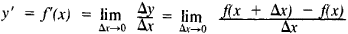 If we ignore the mechanical or geometric content of the cited examples and focus instead on their common means of solution, we arrive at the concept of a derivative. We define the derivative y’ of the function y =f(x) at point x as the limit (if it exists) of the ratio of the increment of the function to the increment of the argument as the latter approaches zero, that is,