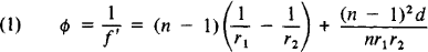 All of the parameters determining the optical properties of a lens bounded by spherical surfaces may be expressed in terms of the radii of curvature r1 and r2 of the surfaces, the lens thickness along the axis d, and the index of refraction n of the lens’ materials. For example, the lens power and the focal length of a lens are given by the relationship