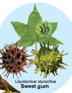 a genus of plants of the family Hamamelida-ceae (sometimes attributed to the family Altingiaceae). They are tall deciduous trees with palmatilobate leaves. The small flowers, which are diclinous and lack perianths, are gathered into heads. There are five or six species, distributed in North and South America and in Asia. These trees all exude an aromatic balsam called storax when their bark is damaged. The storax obtained from Liquidambar orientalis and sweet gum (L. styraciflua) is used commercially. Both of these species, which are ornamental, are cultivated on the Black Sea Shore of the Caucasus.