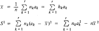 where r is the number of grouping intervals and the ak are their midpoints (in the case of Table la—13.07, 13.12, 13.17, 13.22, and so forth). If the material is grouped according to excessively large intervals, then such a calculation gives inaccurate results. Sometimes in such cases it is useful to resort to special corrections for grouping. However, it makes sense to introduce these corrections only when certain probabilistic assumptions are satisfied.