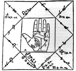 In palmistry, the planets, including the luminaries (the Sun and the Moon), were used to name as well as to represent the principles of certain parts of the hand: Mercury, the little finger; the Sun, the ring finger; Saturn, the middle finger; Jupiter, the index finger; Mars, the center of the palm; Venus, the root of the thumb; and the Moon, the lower mound of the hand. Various other lines and areas also bore the names of planets. The classical elements were utilized in certain systems of hand classification, so some palmistry books refer to water hand, earth hand, fire hand, and air hand. As a student of astrology might anticipate, a water hand indicates a sensitive disposition, an air hand indicates an intellectual nature, and so forth. Despite palmistry’s wholesale borrowing of astrological terminology, modern astrologers have shown little or no interest in studying correlations between patterns in palms and patterns in astrological charts.