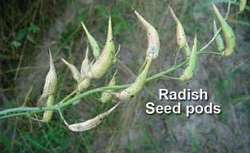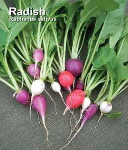 (Raphanus sativus), a vegetable plant of the family Cruciferae. There are annual varieties (European varieties), which form roots and seeds in the year in which they are planted, and biennial varieties (Chinese, Japanese, and winter varieties), which form roots in the first year and seeds in the second year. In the USSR, the European varieties are most commonly cultivated. The leaves are strongly or only slightly dissected; in the Chinese varieties they are sometimes entire. Most of the European varieties have small roots (7–20 g), which range in shape from round-flat to elongate-cylindrical. The roots are red, pink, white, violet, or yellow. The vitamin C content is 25–30 mg percent in the roots and 50–60 mg percent in the leaves. The roots are usually eaten fresh in salads, as are the young leaves of the slightly pubescent varieties. The flowers, which are white, pink, or lilac, bloom 50 to 70 days after planting. The fruits are indehiscent siliques measuring 2.5–7.5 cm in length.