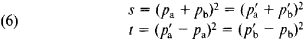 In the center-of-mass system, the quantity s is equal to the square of the total energy of the system: s = (Ea + Eb)2. The quantity t in such a system is equal to the negative of the square of the transferred three-momentum: t = - (p′a - pa)2. In terms of the scattering angle Θ, t = - 2p2(1 - cos Θ), where ρ is the momentum of the particles in the center-of-mass system.