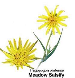 Another dandelion-type plant with yellow flowers and fluffy round seed heads, but the leaves look more like grass. The whole plant is edible- root, stem, leaves and flower. The young shoots are best. Eat stems and leaves when they are still tender. Can be steamed like asparagus. Many people think this stuff is simply a type of grass growing, but look closer. WESTERN SALSIFY Yellow Goatsbeard (Tragopogon dubius)