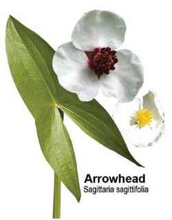 Water plant. Arrowhead-shaped leaves. White rounded flowers with 3 petals. Roots can be eaten like potatoes, used for indigestion. Leaf tea used for rheumatism.
