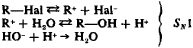 Depending on the structure of the hydrocarbon radical (R) and the reaction conditions, hydrolysis of halogen derivatives can proceed as a monomolecular process (SNl) or a bimolecular process (SN2). In the case of a monomolecular reaction there is initial ionization of the carbon-halogen bond, followed by reaction of the resultant carbonium ion with water. If alkali is added it does not affect the rate of hydrolysis and serves only to neutralize the hydrohalic acid that is liberated and to shift the equilibrium: