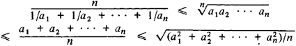 (2) Inequality for means. The most famous inequality relates the harmonic mean, the geometric mean, the arithmetic mean, and the root-mean-square: