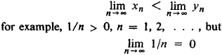 that is, nonstrict inequalities are preserved by the limiting process: however, it does not follow from xn < yn that