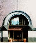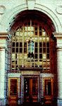 The point of entry into a building: an exterior door, a vestibule, or a lobby.