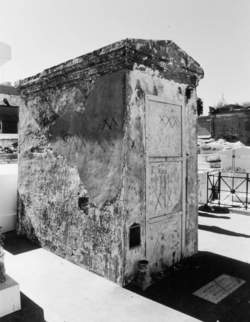 GUÉDÉ—The loa of Death and Sexuality is very much a chthonic deity. He is frequently obscene in both word and gesture. He is usually depicted in formal mourning clothes wearing black spectacles. Yet he is also a great healer. In his Petro aspect he is known variously as Baron Samedi, Baron La-Croix, Baron Cimitière, and The Three Spades (grave digging tools). His symbols are a cross or a spade, a pick, and a hoe or adze.