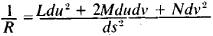 where L = ruun, M - ruv,n, and N = rvu (n is the unit vector of the normal to S at M. Using the second fundamental form, we can achieve an understanding of the spatial form of a surface. For example, the curvatures 1/R of normal sections of the surface at a given point M (that is, the curvatures of the curves of intersection of S with planes passing through the normal at M) are given by the expression