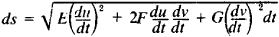 Let s be the length of an arc of a curve L on S, and let u = f(t) and v = g(t) be its parametric equations in the intrinsic coordinates. Then, along L, r and s will be functions of t. The differential of s is determined by the equation ds2= dx2 + dy2 + dz2, the right-hand side of which is the square of the vector dr = vltdu + rrdv, that is, ds2= dr’2. Therefore,