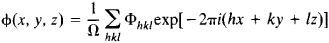 where h, k, and I are Miller indexes and Ω is the volume of the unit cell (seeMILLER INDEXES). The maximum values of φ(x, y, z) correspond to the positions of atoms within the unit cell of the crystal. Thus, the calculation of the values of φ(x, y, z), which is usually performed by computer, makes it possible to establish the coordinates x, y, z of the atoms, the distances between the atoms, and other information.