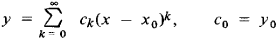Power series are often used for the approximate calculation of values of an implicit function near x0, where the function’s value y0 is known. Thus, if F (x, y) is an analytic function—that is, it may be expanded as a convergent double power series in the neighborhood of the point (x0, y0)]—and if F’y(x0, y0) ≠ 0, then the implicit function defined by the relation F (x, y) = 0 may be obtained in the form of a power series