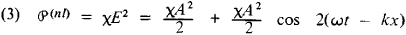 The coefficients x, θ, and so on are called the nonlinear susceptibilities (in order of magnitude, x ~ 1/Ea and θ ~ 1/Ea2). The material equation (2) is the basis of nonlinear optics. If a monochromatic light wave E = A cos (ωt —kx) is incident on the surface of a medium (where A is the amplitude, ω is the frequency, k is the wave number, x is the coordinate of a point along the direction of wave propagation, and t is the time), then according to (2) the polarization of the medium contains—in addition to the linear term PIkA cos (ωi- —kx) (linear polarization)—a nonlinear term of the second order:
