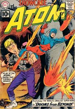 Al Pratt’s Atom was next seen, along with the rest of the Justice Society, a decade later in the 1960s, but only as an occasional participant in their adventures, perhaps because another Atom had been created in his absence. Following the success of the Flash and Green Lantern, DC editor Julius Schwartz was looking for another Golden Age character to revamp when artist Gil Kane brought in some new designs for the Atom. Kane was inspired by Quality Comics’ Doll Man, and his Atom update was similarly a hero who could shrink himself down to an almost microscopic size. Over three issues of Showcase in 1961 and 1962, Schwartz, Kane, and writer Gardner Fox introduced physics professor Ray Palmer, whose experiments with fragments of a white dwarf star enable him to shrink almost at will. After discovering that his best size is six inches, Palmer dons the requisite red-and-blue superhero costume and embarks on a clandestine career as a crime fighter.
