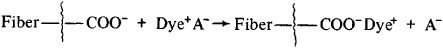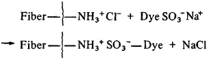 Dyeing with acid and mordant dyes. Acid dyes are soluble in water because of the presence of SO3M groups and, less frequently, COOM groups (where M is Na, K, or NH4), as well as SO2NH2 and SO2CH3 groups. Anthraquinone and azo dyes belong to this class. Acid dyes are used mainly for protein and polyamide fibers, as well as for leather, fur, paper, and wood pulp. In the dyeing process, the dye reacts with the fiber according to the scheme