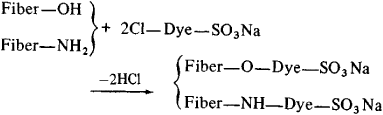 Dyeing with reactive dyes. Reactive dyes are used for dyeing cellulose, protein, and polyamide fibers. Such dyeing consists of two stages: soaking the fiber material in the dye solution and fixation in a basic medium. In the fixation stage, the dye reacts with the fiber to form a new coloring compound—for example,