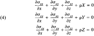 where ρ is the density of the material and X, Y, and Z are the projections, onto the coordinate axes, of the body force—for example, the force of gravity—acting on each particle of the body; the projections represent the body force per particle mass.