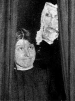 Eva C. was also studied by the British Psychical Research Society, though she failed to impress them. In her later séances, she was unable to produce as well-developed forms as earlier and the materializations were much slower and seemed more difficult. Eva was made to wear special dresses or even, on many occasions, to sit in the nude. A battery of eight cameras, two of them stereoscopic, was trained on her and 225 photographs obtained, the sittings being held in good light. Of a séance held on April 15, 1912, Professor Richet said, “The manifestations began at once. White substance appeared on the neck of the medium; then a head was formed which moved from left to right and placed itself on the medium’s head. A photograph was taken. After the flashlight the head reappeared by the side of Eva’s head, about sixteen inches from it, connected by a long bunch of white substance. It looked like the head of a man … a woman’s head then appeared on the right.” The medium was carefully searched both before and immediately after the sitting.