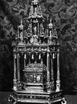 Throughout the year, the vial of blood is kept in the chapel of the Holy Blood on the central square in Bruges. The church was originally built in the twelfth century, with a second story added in the fifteenth. It has subsequently gone through several extensive renovations. The blood, originally kept on what is now the ground level, rests on a silver altar in the church’s upper level. It is on public view each Friday and every day from May 3 through May 17. Adjacent to the church is a museum that details the story of the Holy Blood and contains other items of value owned by the church.