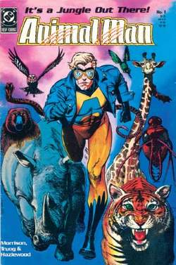 Animal Man (1988–1995) starred a nearly forgotten 1960s hero who could take on the powers of animals around him. Reinvented by writer Grant Morrison, family man Buddy Baker attempts to revive his superhero career, discovering that his connection to animals runs deeper than he had previously thought, thanks to his alien-initiated link to a “morphogenic field” generated by all living things. By the end of Morrison’s run, with issues #25-#26 (July-August 1990), Baker even realized that he was a comic book character. Future issues continued the exploration of Baker’s connection to nature, as well as animal rights issues, suicide, and religion. Animal Man became a Vertigo title with issue #57 (March 1993).