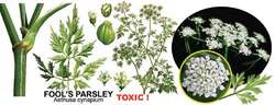 Toxic Related to Poison Hemlock, but less poisonous. Has hollow branched stem and unpleasant foul-smelling smooth leaves. Looks similar to carrot, but carrot smells like carrot.